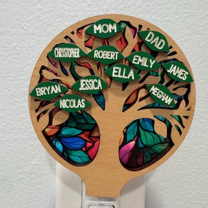 The nightlights are 3 layers, two layers of wood with a thin layer of acrylic in between. The acrylic in the middle is a transparent bright print for the light to shine through. Acrylic color in the middle will vary but will be multicolor.