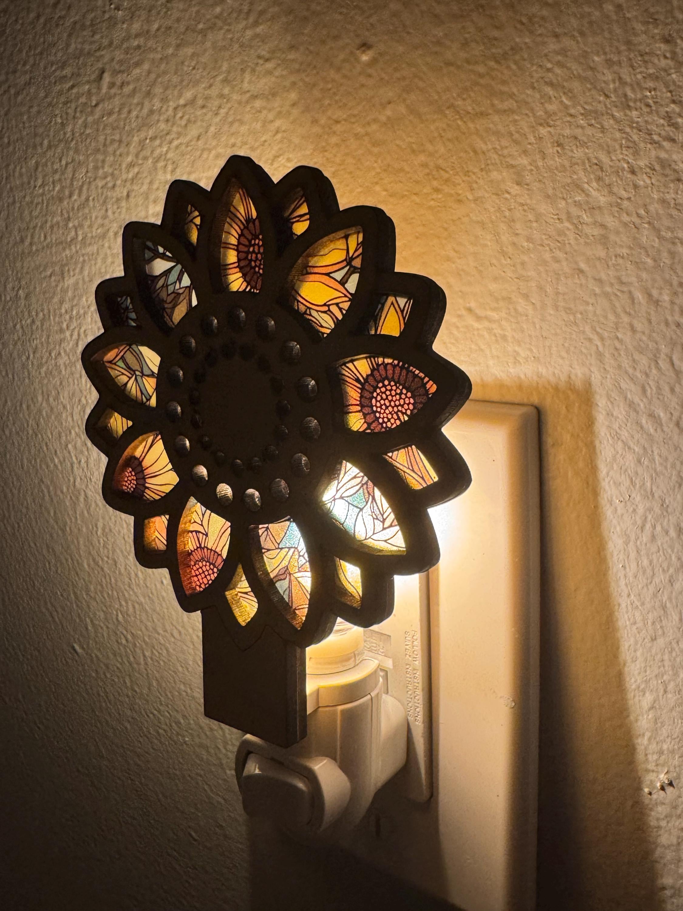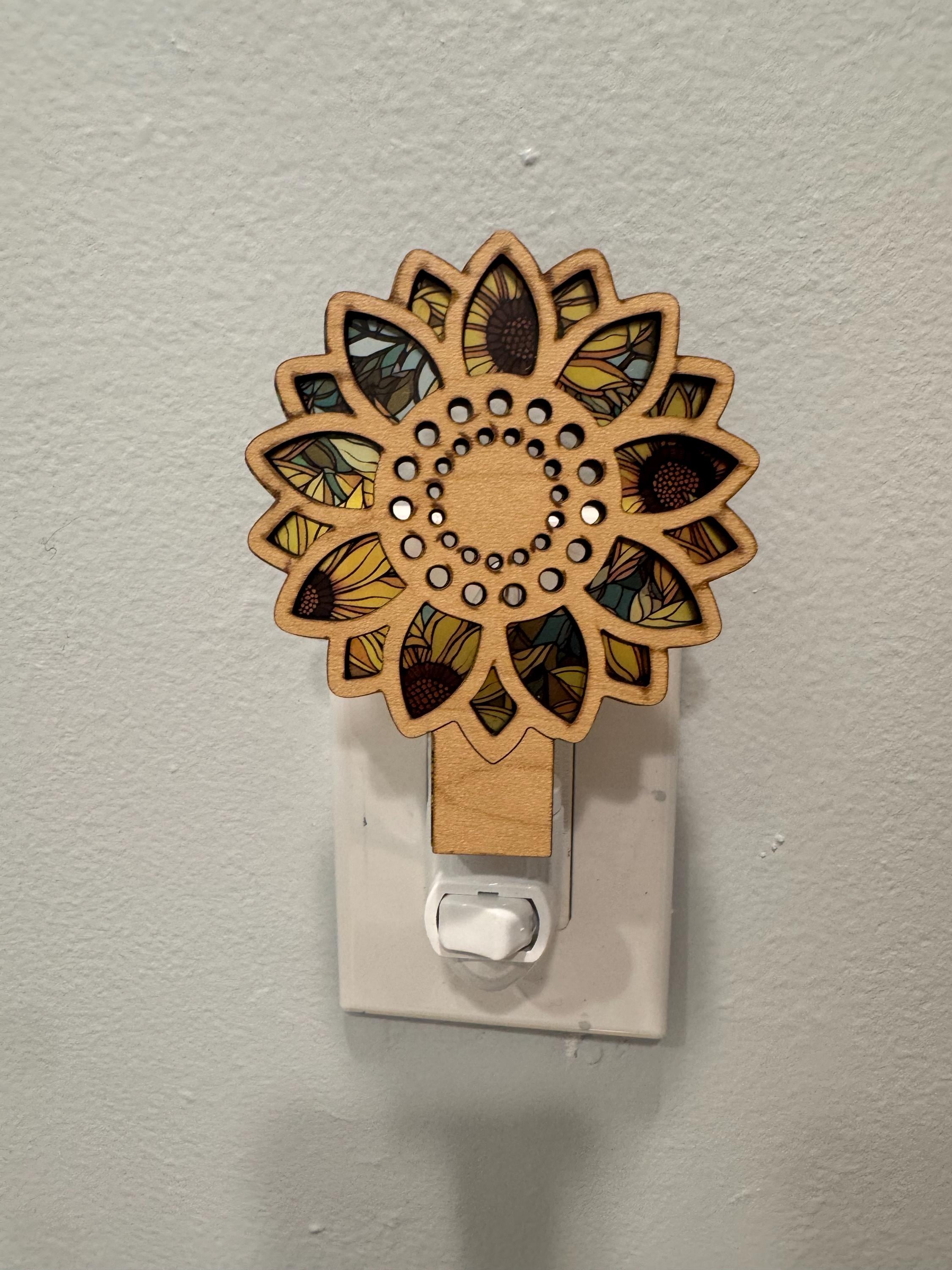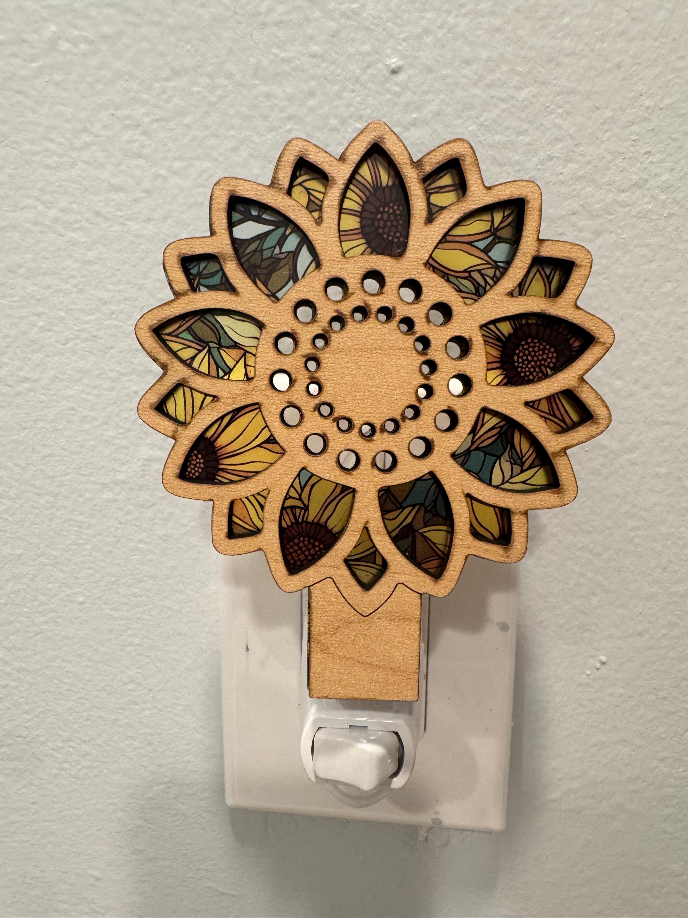 Bring a touch of warmth and nature into your space with this charming 3-layered wood and acrylic sunflower nightlight. Perfect for any room, this beautifully crafted piece features intricate detailing that gives the sunflower a vibrant, 3D look.