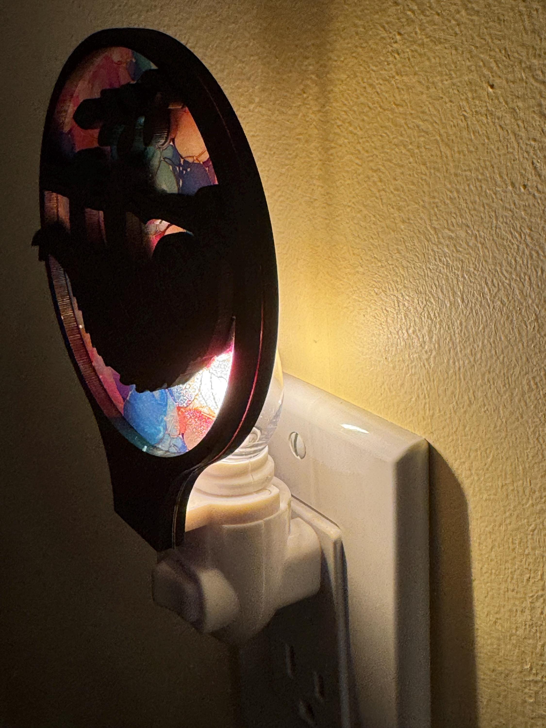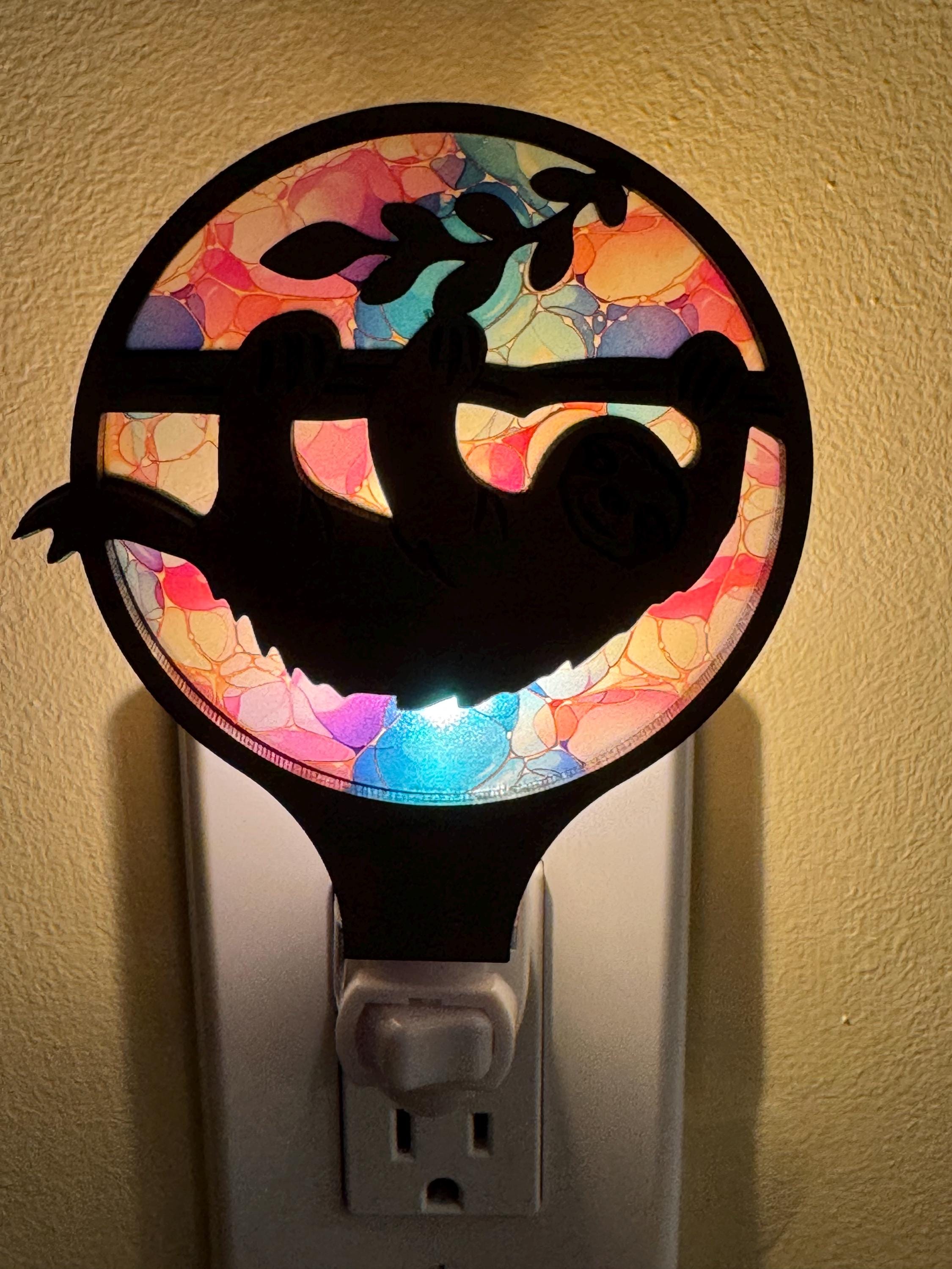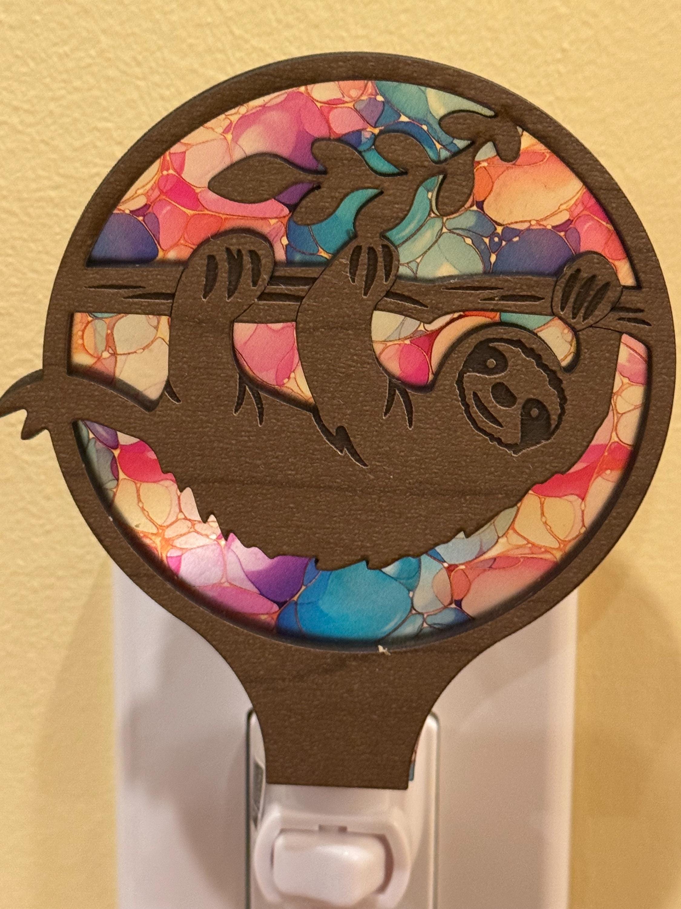 Made from two layers of wood with a colorful, flexible acrylic accent sandwiched in between, this nightlight glows beautifully when lit. Each piece is carefully crafted to highlight the playful sloth design, perfect for adding a cozy and fun touch to any room.