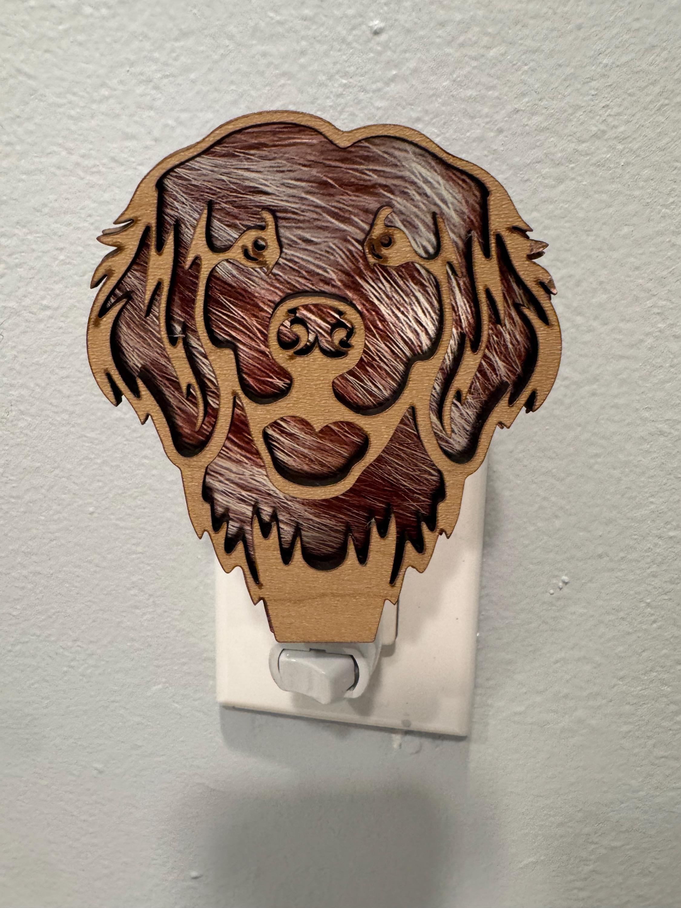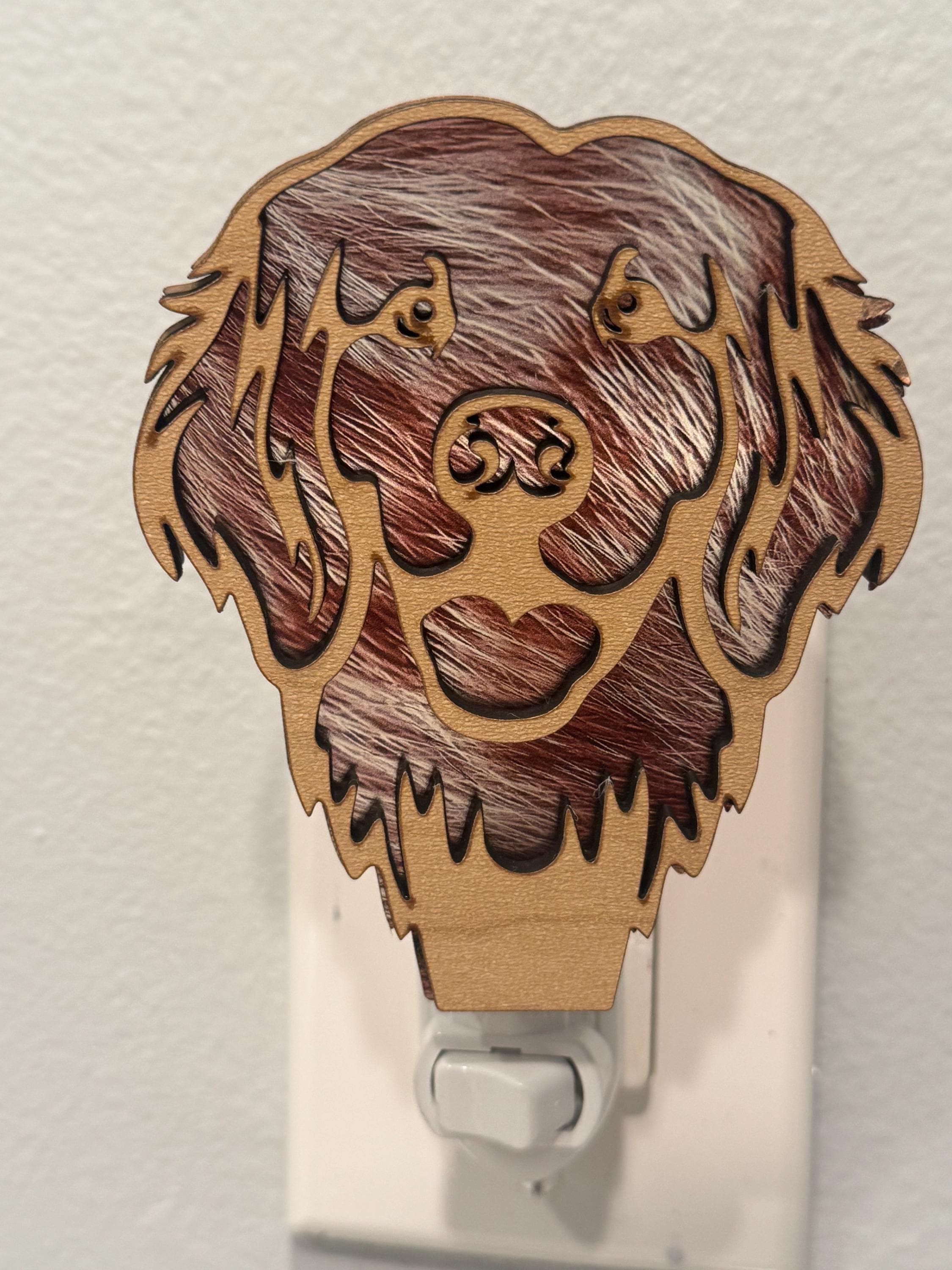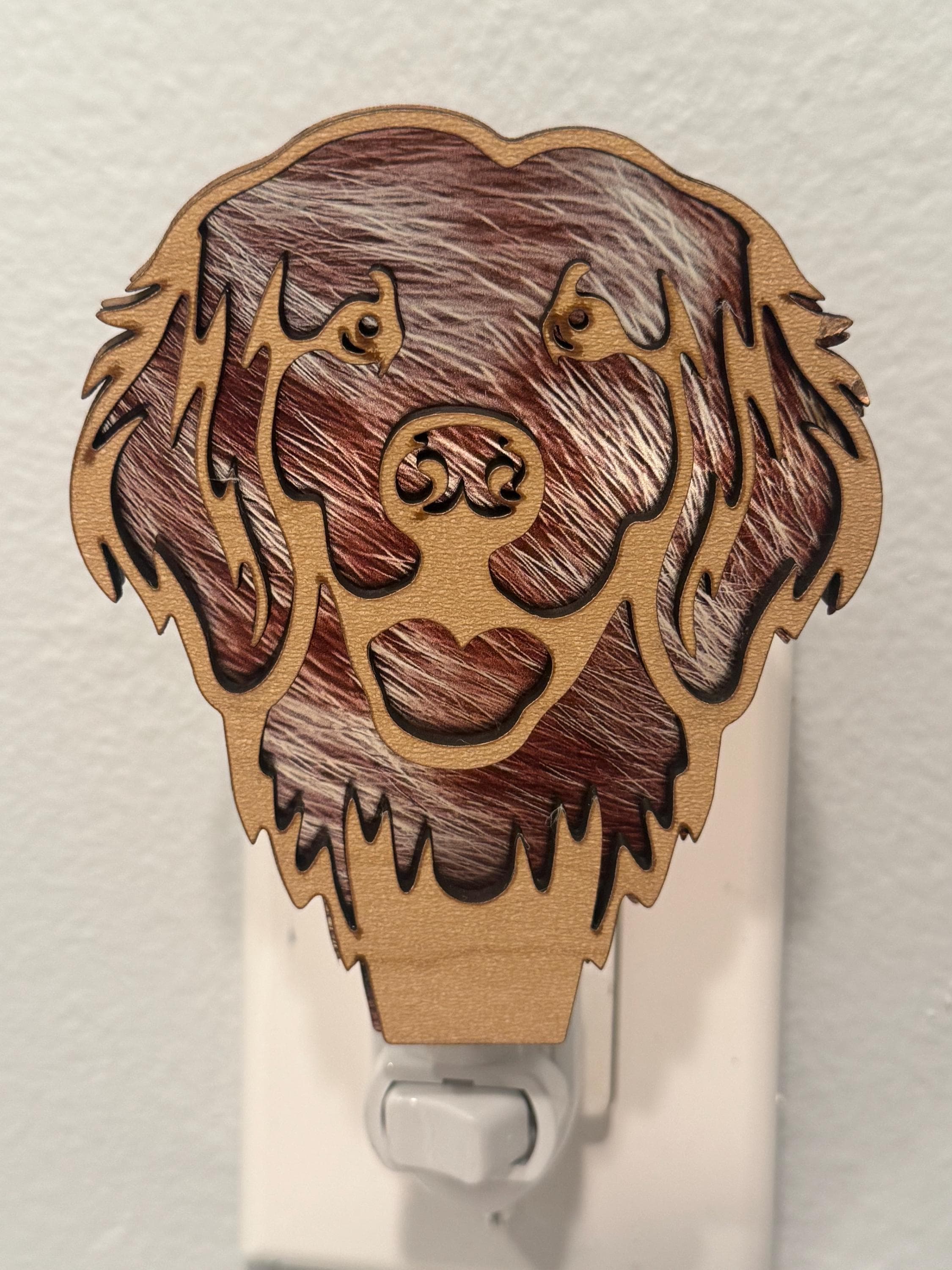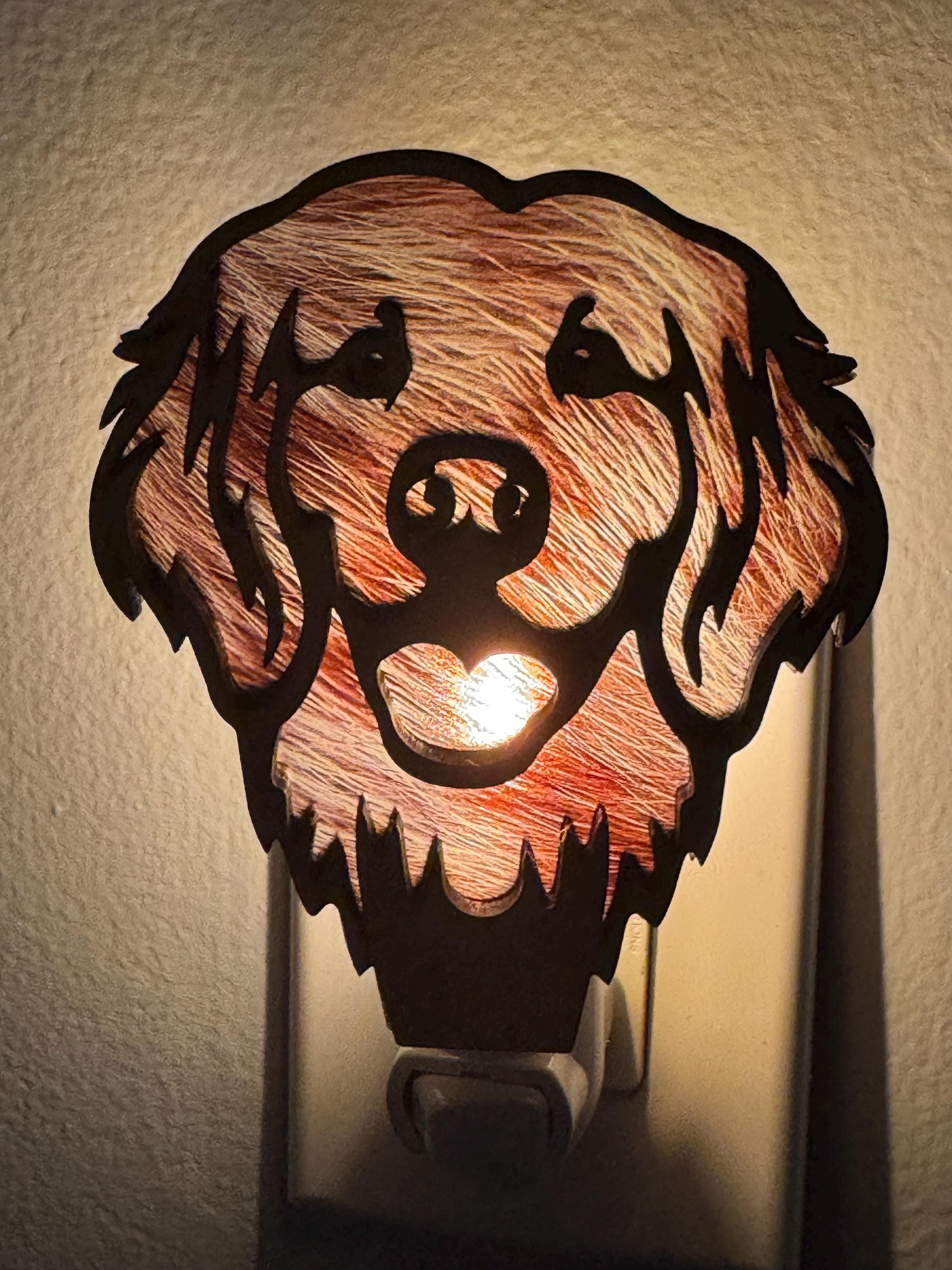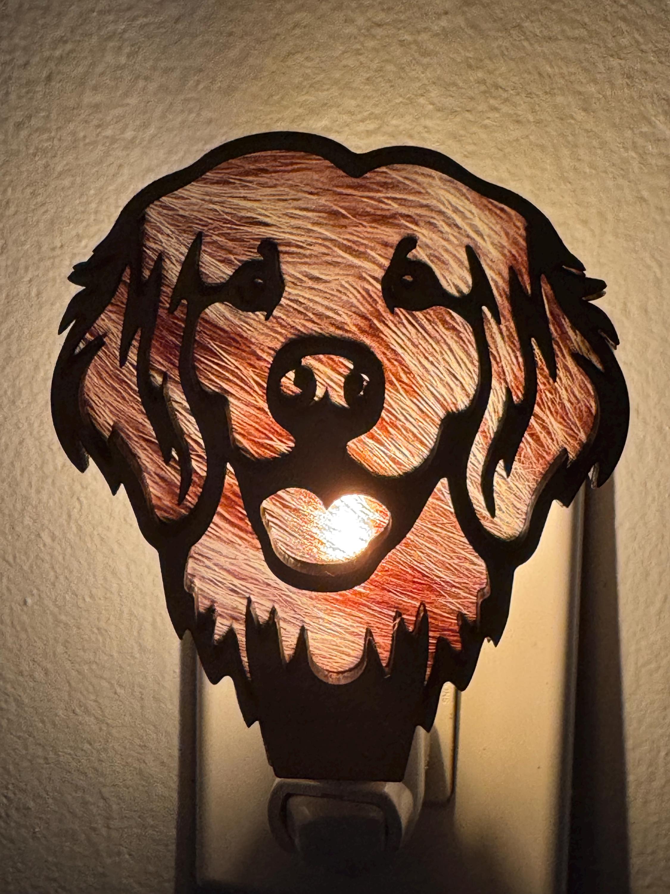Light up any room with this adorable Golden Retriever nightlight! Handmade from two layers of wood with a flexible acrylic center, this nightlight features a charming fur-pattern design nestled between the wooden layers, giving your pup a warm, dimensional glow when lit.