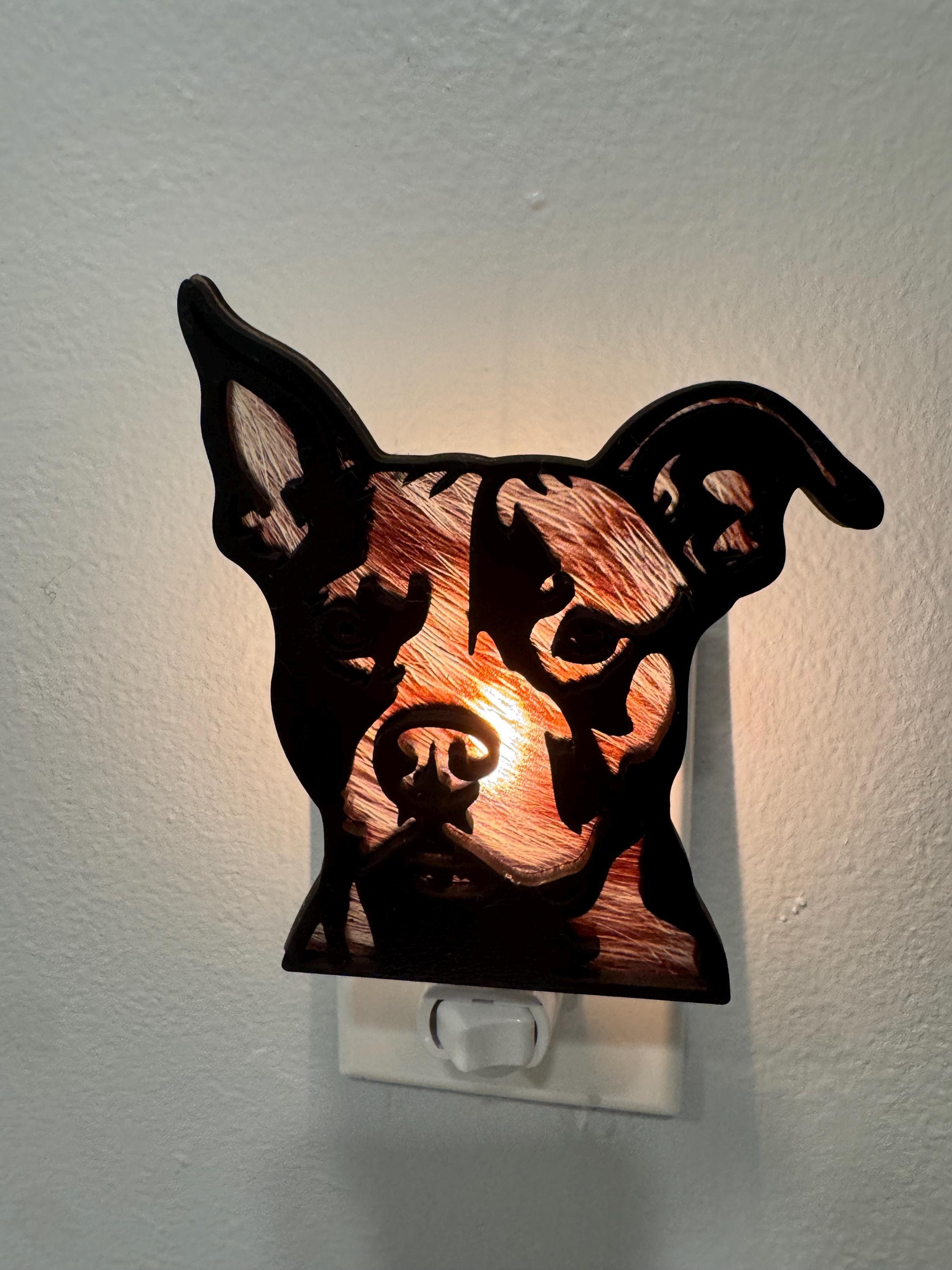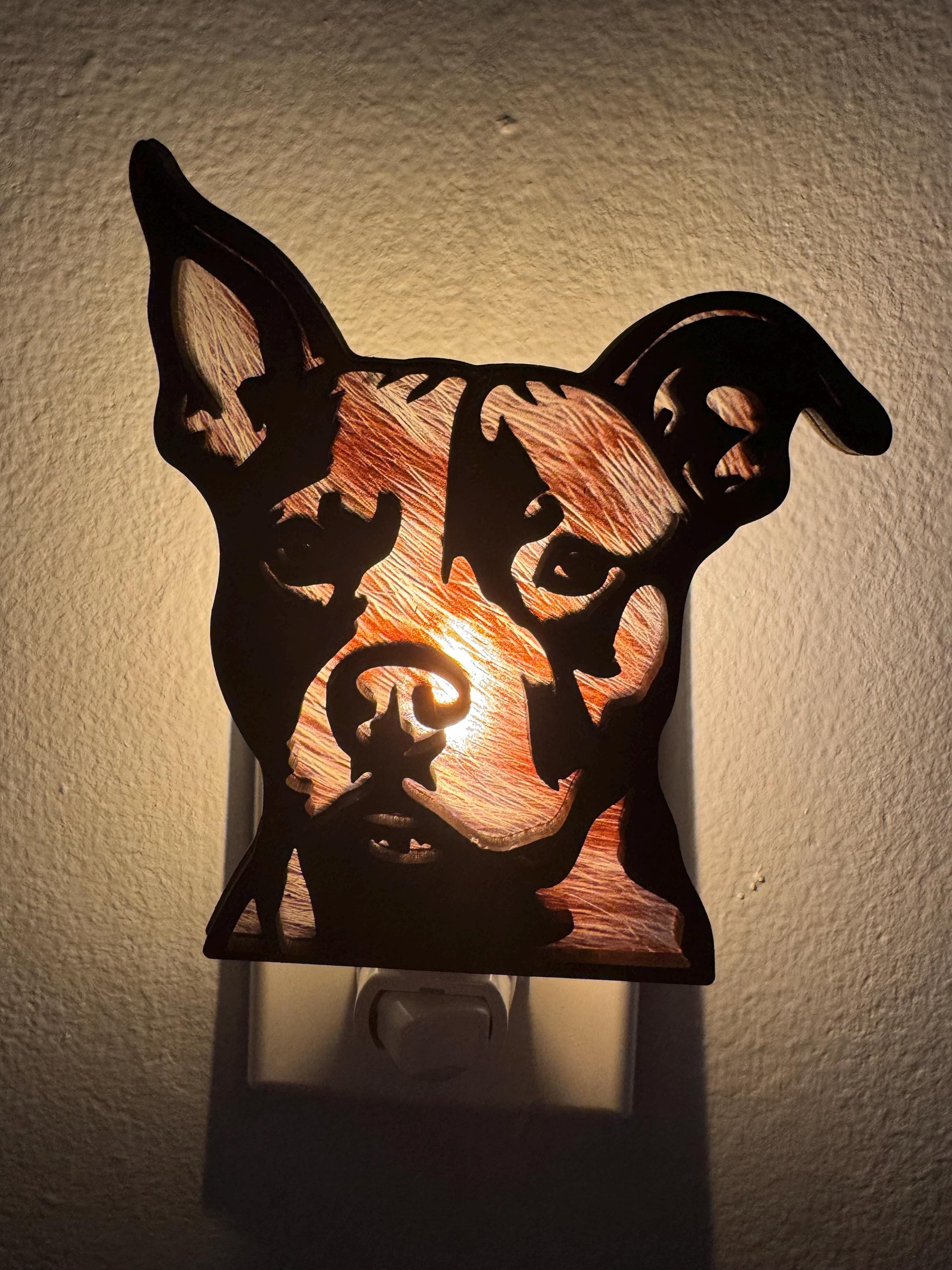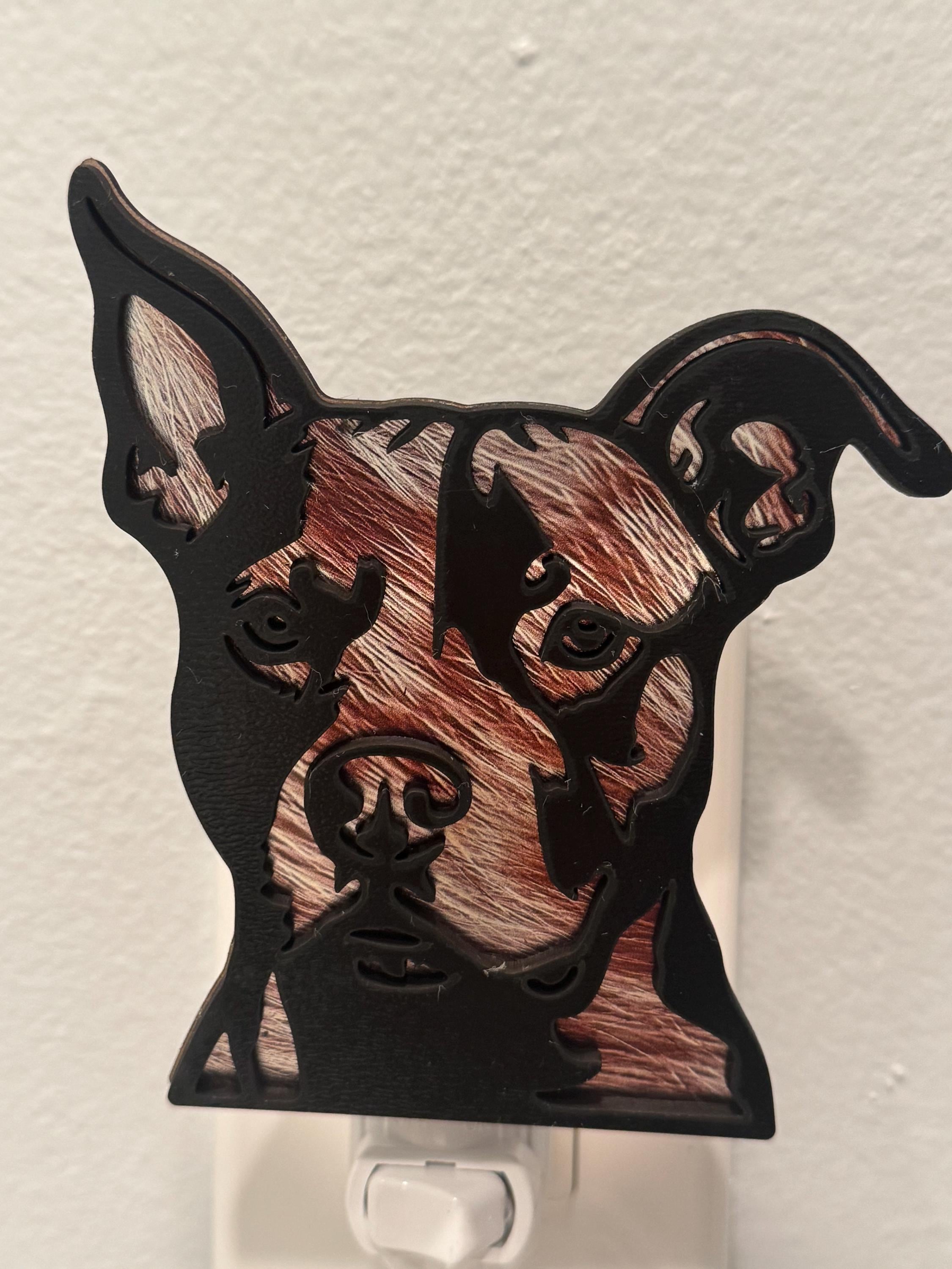 Light up any room with this adorable Pit bull nightlight! Handmade from two layers of wood with a flexible acrylic center, this nightlight features a charming fur-pattern design nestled between the wooden layers, giving your pup a warm, dimensional glow when lit.