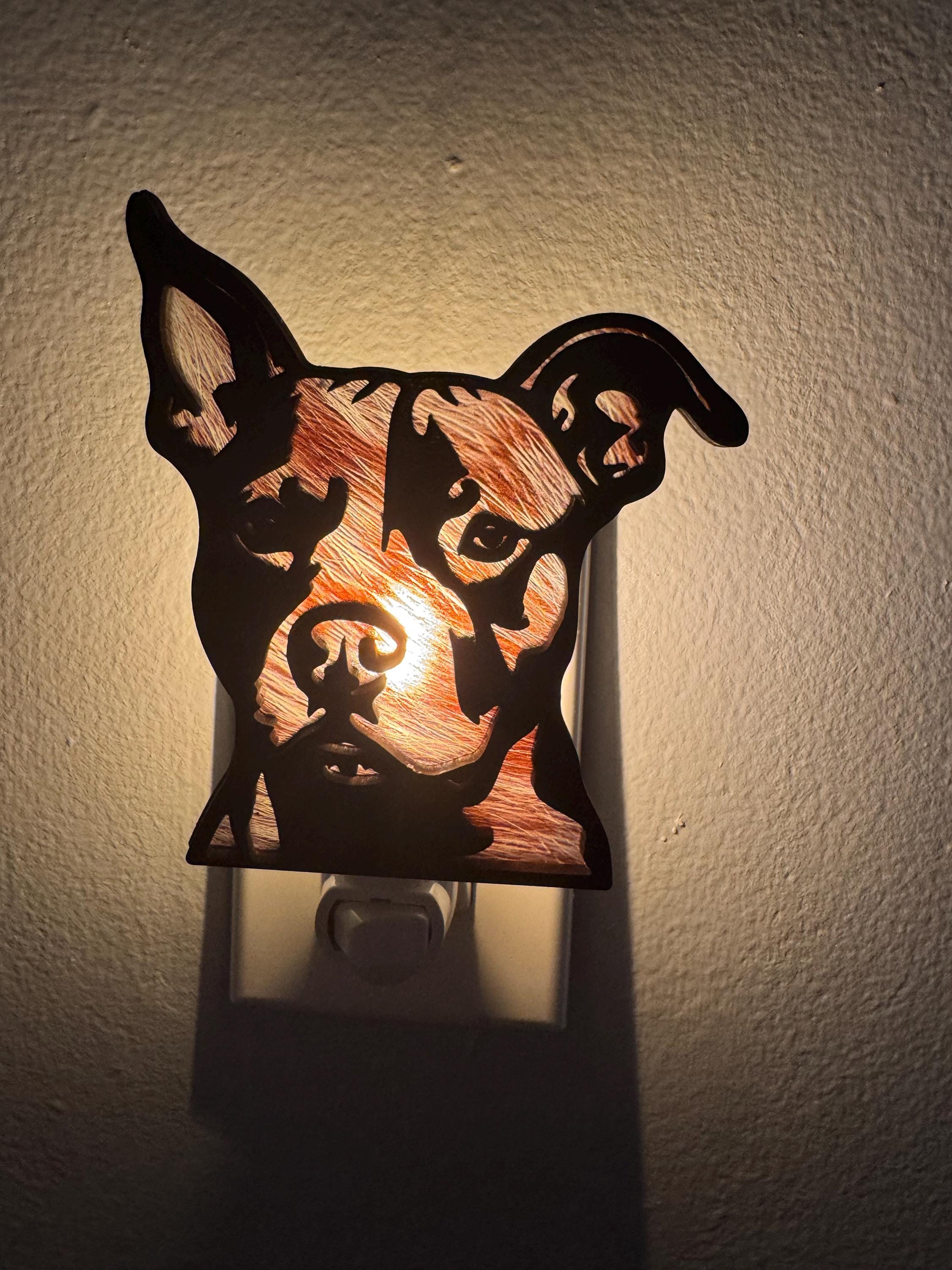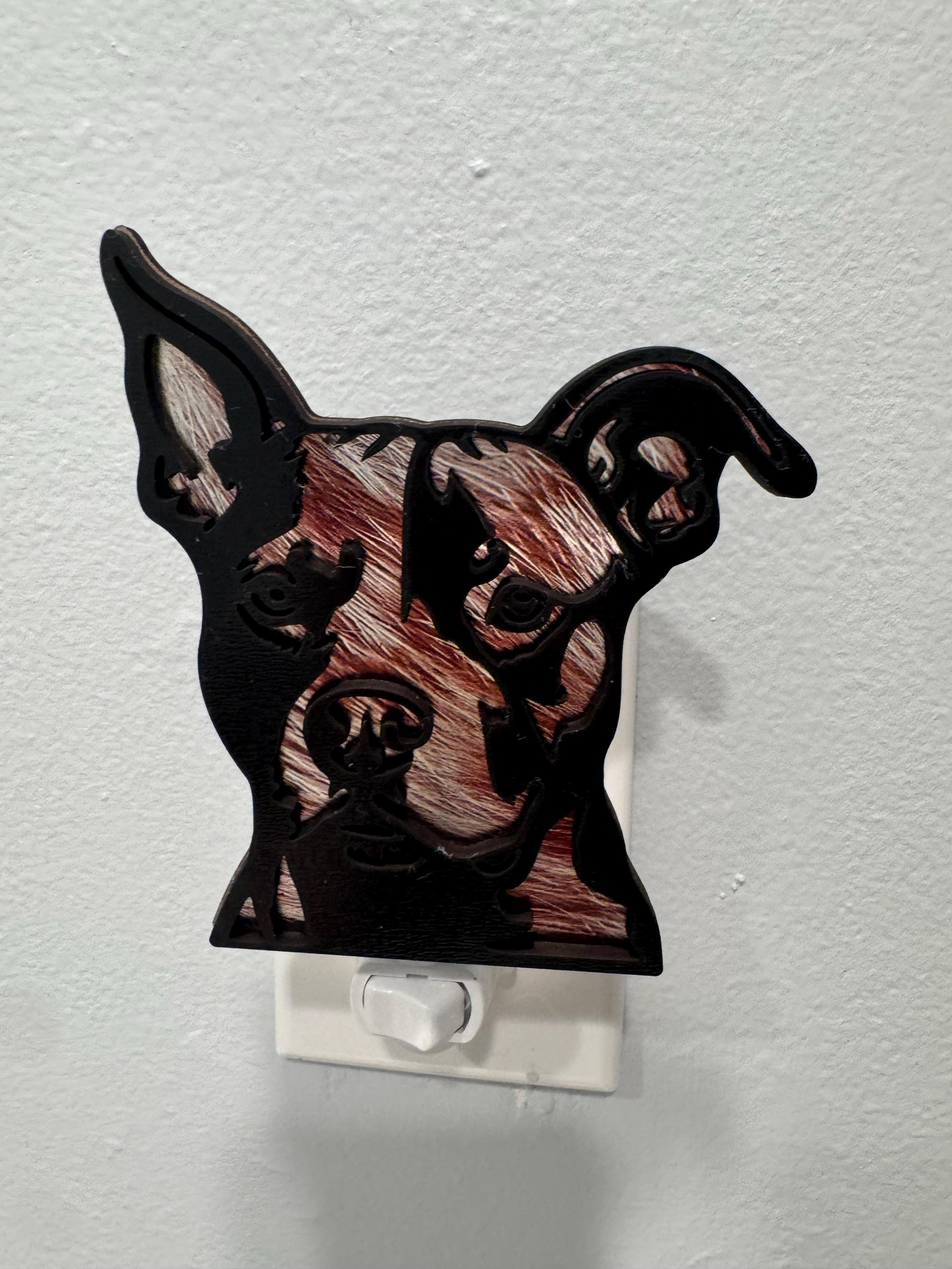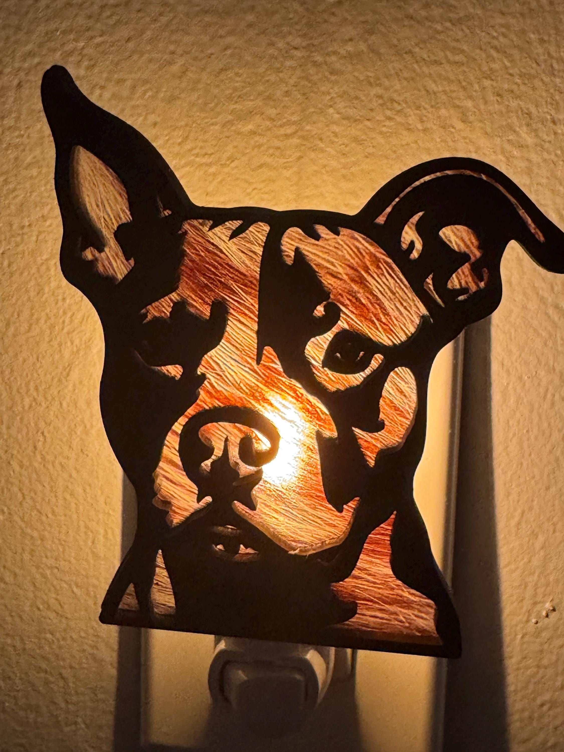 Light up any room with this adorable Pit bull nightlight! Handmade from two layers of wood with a flexible acrylic center, this nightlight features a charming fur-pattern design nestled between the wooden layers, giving your pup a warm, dimensional glow when lit.