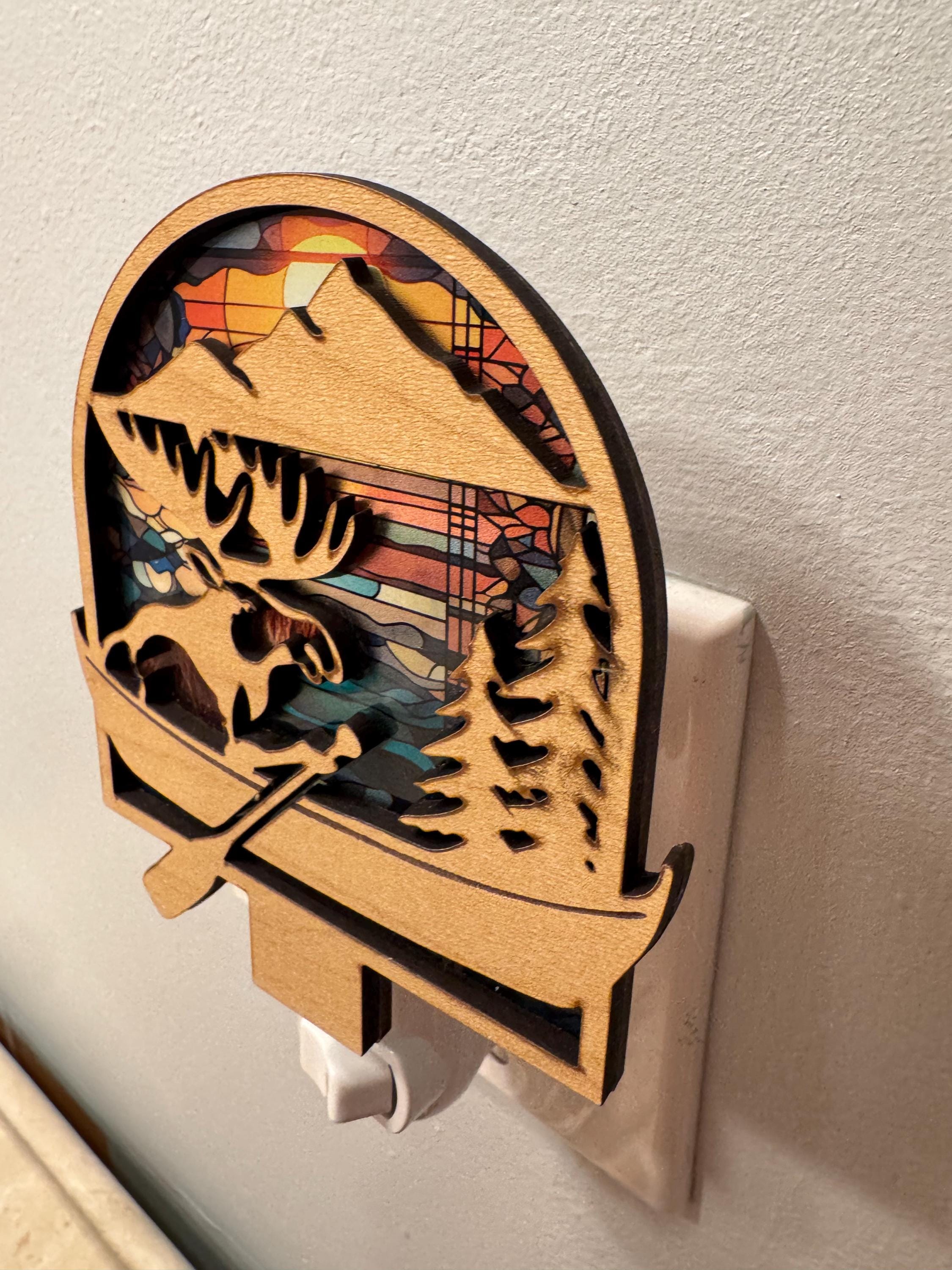 Bring a touch of woodland charm to any space with this adorable Moose in a Canoe Nightlight. Carefully crafted from two layers of wood with a flexible acrylic layer in between, this design glows softly when lit, highlighting the playful silhouette and layered details.