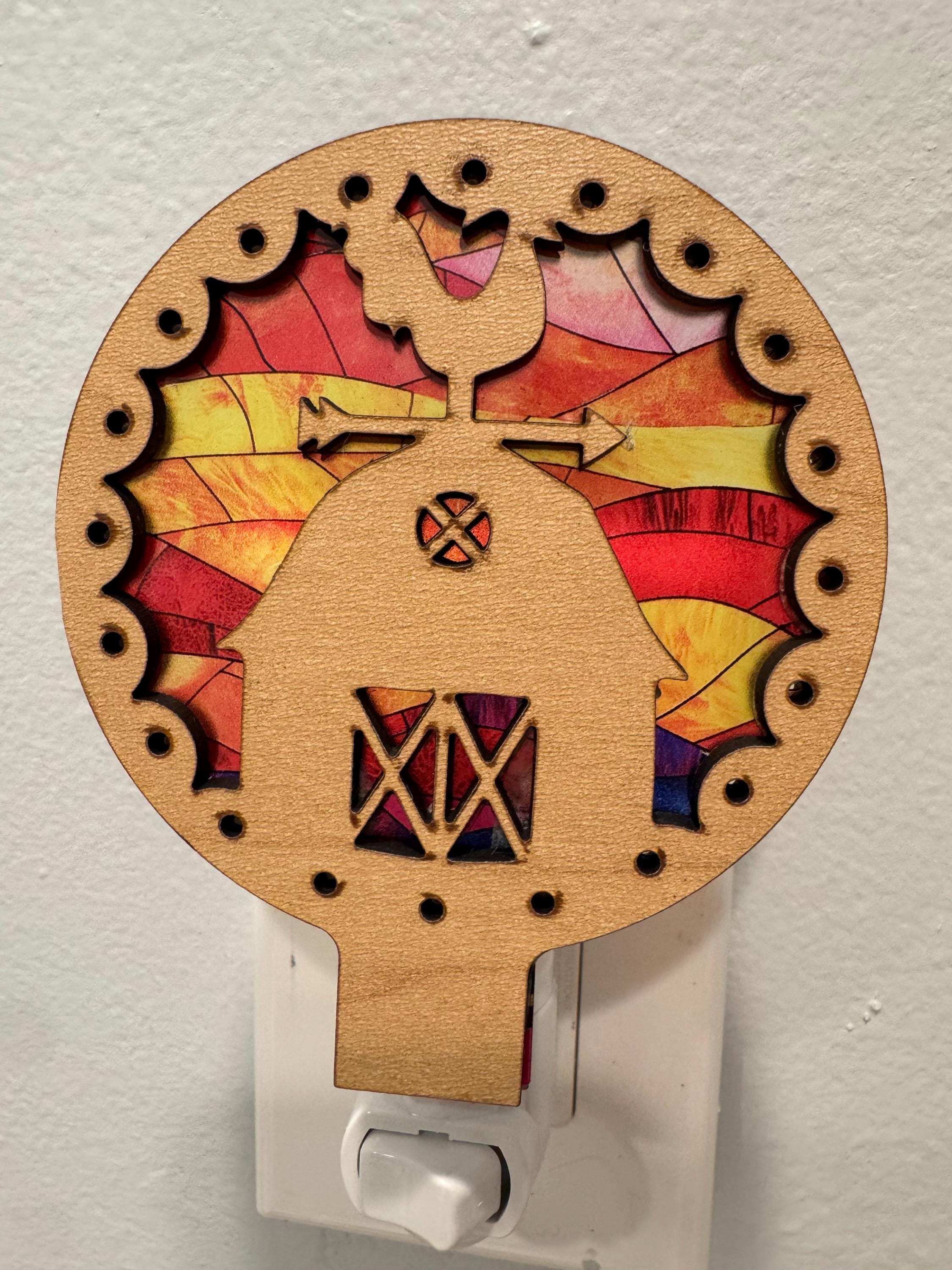 This nightlight is carefully laser cut from two layers of maple MDF, with a flexible sunrise-themed acrylic layer sandwiched in between. When illuminated, the layered design creates a beautiful stained-glass effect in rich sunrise colors, highlighting the windmill silhouette for a unique and eye-catching glow.