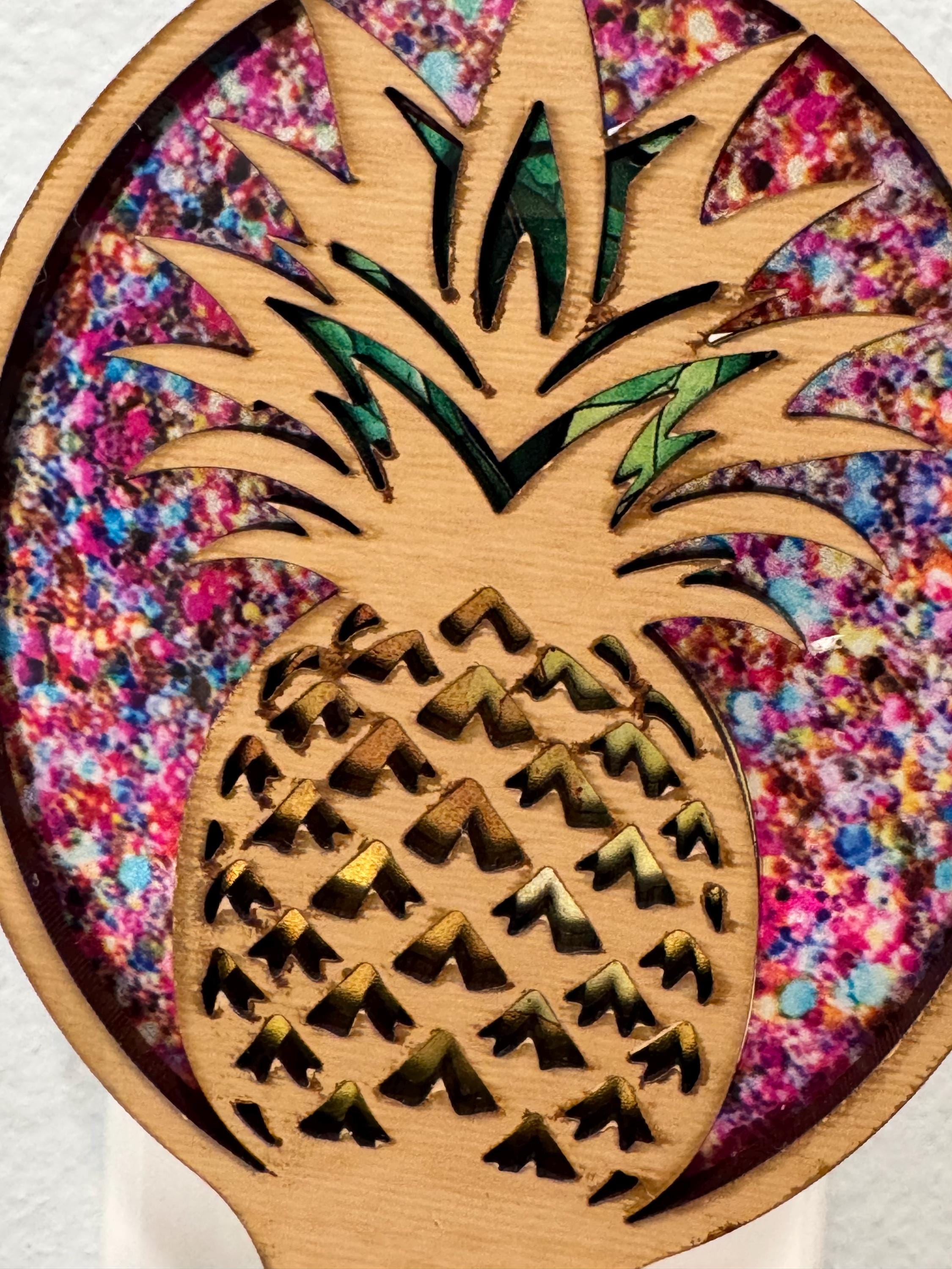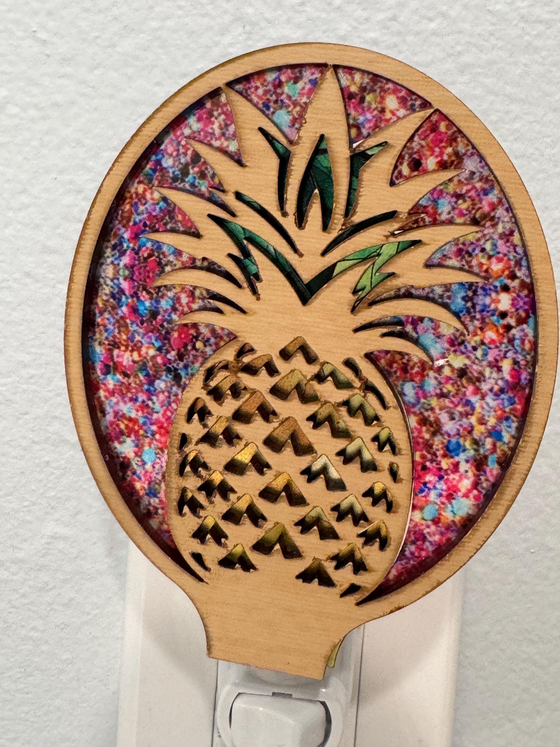 Welcome warmth and tropical charm into any room with this handcrafted pineapple night light! Featuring a laser-cut wood pineapple design layered over vibrant multicolor splatter acrylic, this night light glows beautifully and doubles as a decorative piece even when the light is off.